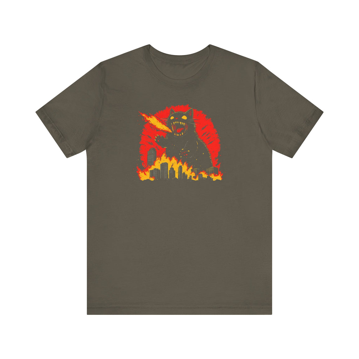 Ignite the chaos with our Catzilla Firestorm T-Shirt! 🐱🔥 This intense design features a ferocious Catzilla breathing flames, setting the city ablaze. Perfect for those who love bold and dramatic fashion, this tee brings a fiery edge to your wardrobe. Let Catzilla’s firestorm add some heat to your style!